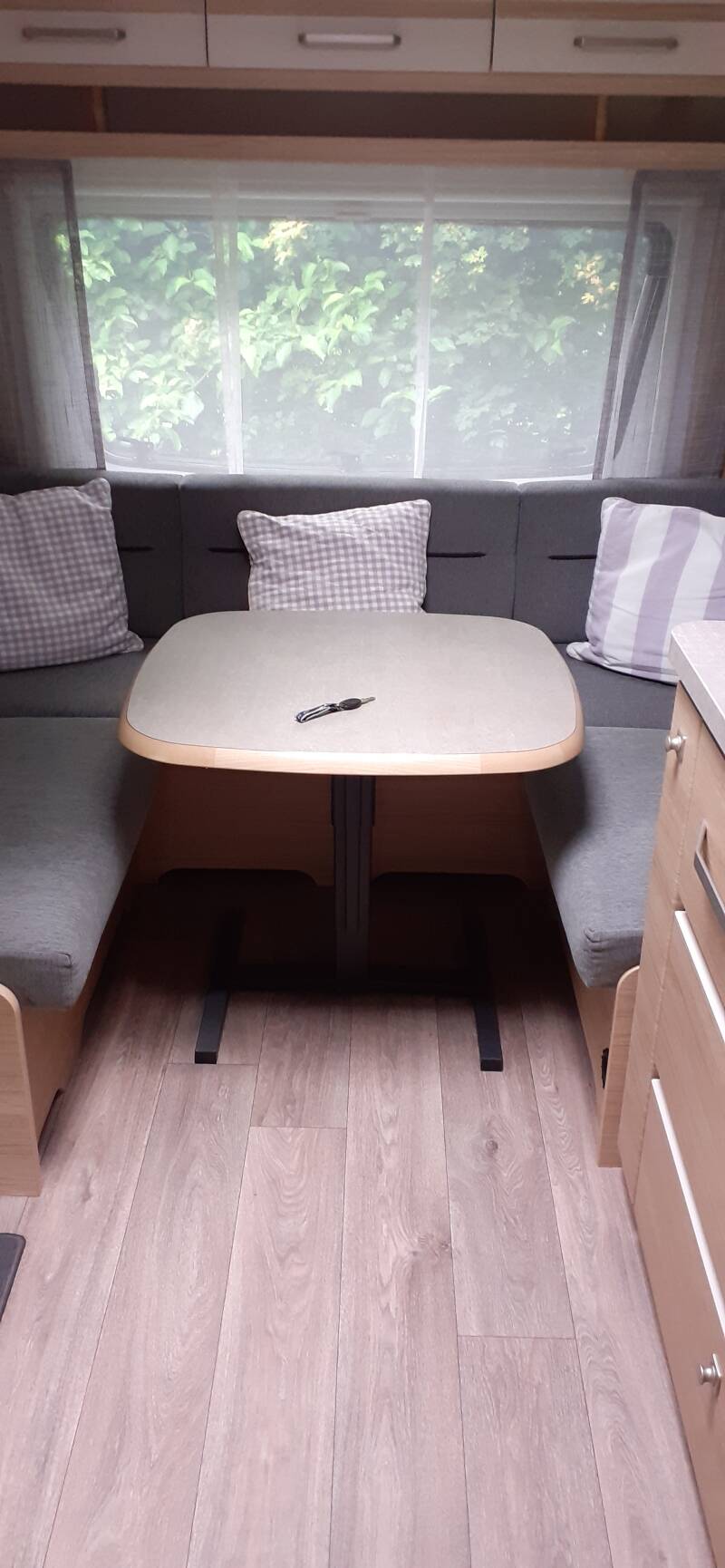 Einteilung Wohnwagen Bianco: einen Schlafzimmer mit zwei Einzelbetten. Küche inclusive Zubehör und eine Chemietoilette. Eine große Sitzgruppe, die umgebaut werden kann zu einem Schlafplatz für zwei Personen. Kopfkissen und Deckbetten sind vorhanden.