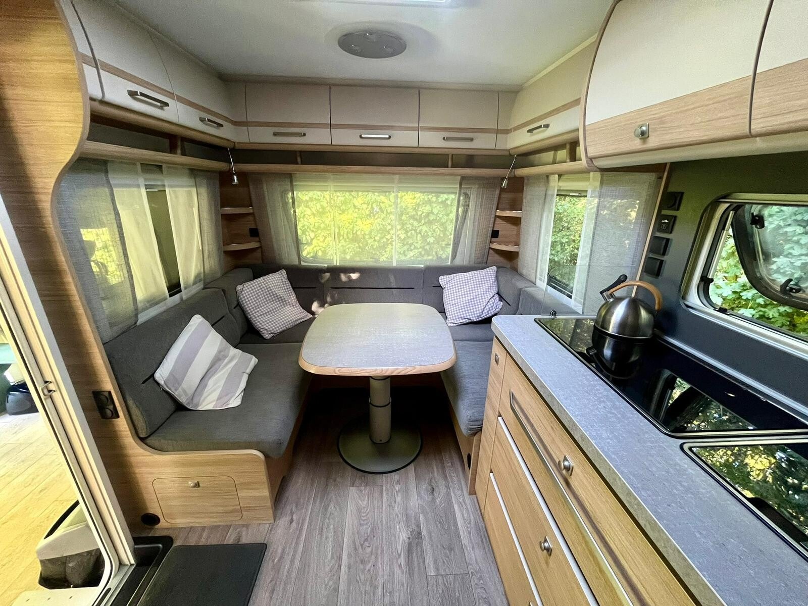 Layout Apero caravan: on the left a bunk bed, this room can be closed by a folding wall. In the middle an u-shaped seating that can be transformed into a double bed. Opposite a kitchen with accessories. On the right a fixed double bed, also this room can be closed by a folding wall. The chemical toilet also is in this room. Pillows and duvets are present.